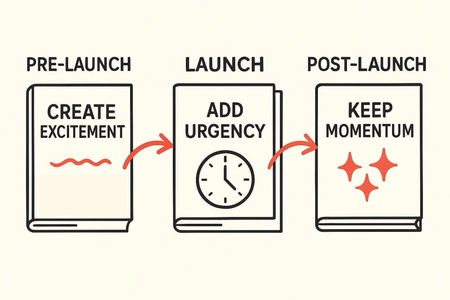 Launch phase implements strategic scarcity and social proof. Even PLR-based products benefit from limited-time bonuses, founding member pricing, or exclusive access periods. Create urgency through deadlines, not artificial scarcity.